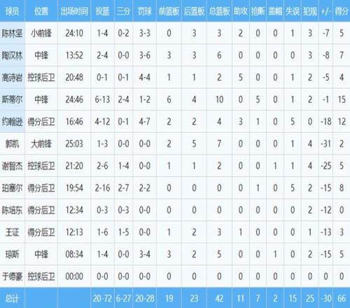 本場比賽,山東隊刷新了多項恥辱紀(jì)錄,面對寧波的13連勝被終結(jié),66分為賽季單場最低分,30分的分差也是本賽季最慘痛的一場失利。山東隊只有斯蒂爾表現(xiàn)出色,全場得到15分10籃板5搶斷的兩雙數(shù)據(jù),他在場時,全隊僅僅輸了1分。約翰遜雖然得到12分4籃板3助攻,但出現(xiàn)了多達(dá)5次失誤,正負(fù)值為-18。其他隊員無人得分上雙,珀塞爾和瓊斯的正負(fù)值均為-15,謝智杰-25,郭凱更是達(dá)到了驚人的-31。