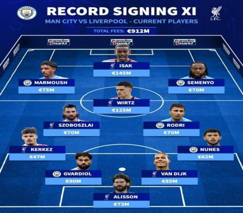 利物浦、曼城現(xiàn)役最貴簽約陣容:
