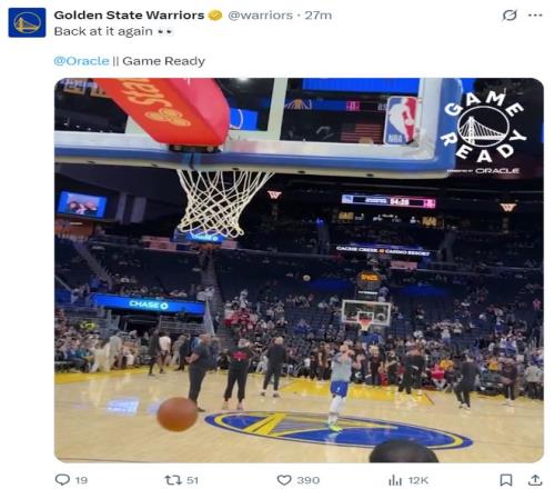 賽前庫(kù)里的熱身表現(xiàn)很不錯(cuò),logo三分與扣籃都有。