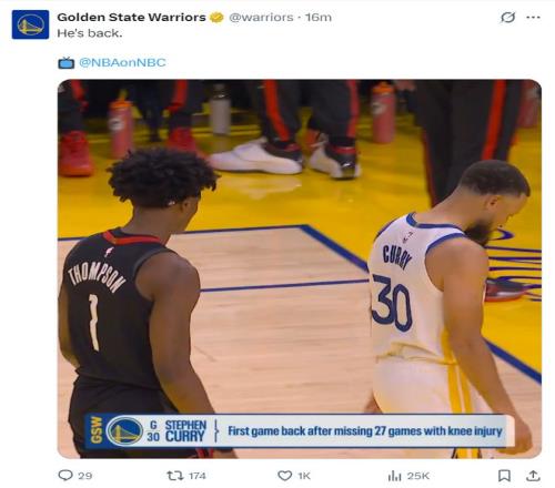 NBA轉(zhuǎn)播方給出庫(kù)里已經(jīng)連續(xù)傷停27場(chǎng)比賽。
