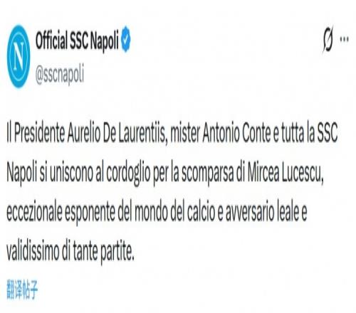 “那不勒斯足球俱樂部主席奧雷利奧·德·勞倫蒂斯、教練安東尼奧·孔蒂以及全體那不勒斯隊隊員共同哀悼米爾恰·盧切斯庫的逝世,他是足球界一位杰出的人物,也是許多比賽中一位忠誠而值得尊敬的對手?!?/p>
