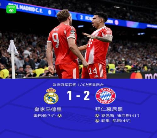 北京時(shí)間4月8日歐洲冠軍聯(lián)賽 1/4決賽首回合,皇家馬德里對(duì)陣拜仁慕尼黑?;始荫R德里姆巴佩破門。拜仁慕尼黑路易斯-迪亞斯破門,哈里-凱恩破門。最終比分皇馬 1-2 拜仁。