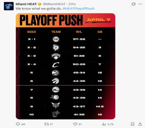 這場比賽后熱火41勝38負排在東部第十,他們距離東部第九的黃蜂已經(jīng)差1.5個勝場,距離東部第六的猛龍差著3個勝場。