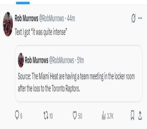 根據(jù)NBA記者Rob Murrows的報道,在這場失利后熱火隊召開了內(nèi)部的會議,而這個會議的氣氛非常緊張。