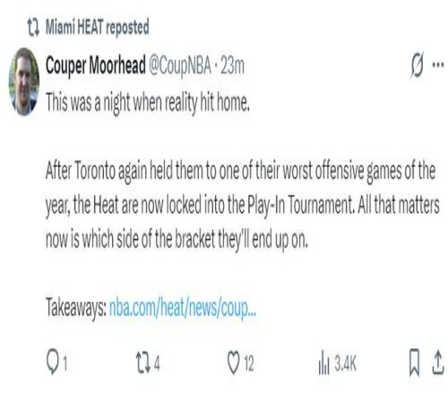 熱火記者Couper寫道:這是一個讓人深有感觸的夜晚,熱火在多倫多再度被限制出本賽季最差的進攻表現(xiàn),熱火已經(jīng)確定參與附加賽,現(xiàn)在唯一的懸念就是熱火最終排在附加賽上半?yún)^(qū)還是下半?yún)^(qū)。