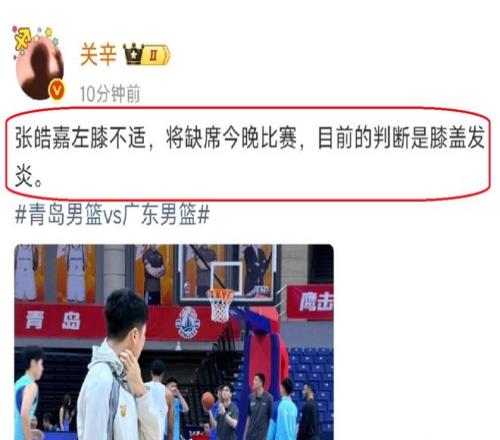 根據(jù)廣東隊隨隊記者關(guān)辛表示,張浩嘉因為左膝受傷,將會無緣與青島隊的比賽,根據(jù)了解,張浩嘉的膝蓋出現(xiàn)了發(fā)炎,而且,還是比較嚴(yán)重。在賽前,張浩嘉也是沒有參加訓(xùn)練,只是來到場邊,給隊友撿球。