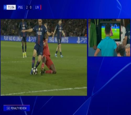 體育播報04月09日宣 巴黎vs利物浦第70分鐘,科納特身后鏟倒埃梅里,裁判判罰點球。VAR介入,裁判觀看回放后取消黃點判罰。