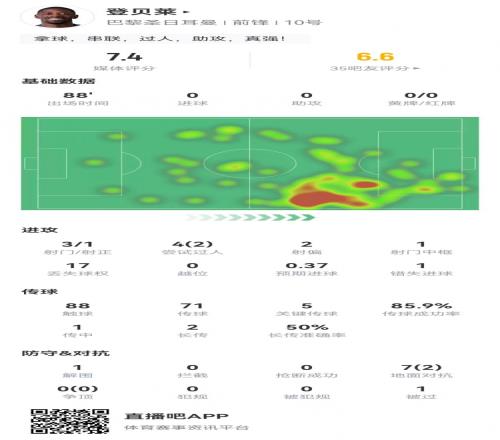 登貝萊本場3射1正1中框+1失良機(jī)5關(guān)鍵傳球17丟失球權(quán)7對抗2成功
