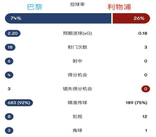 【18】巴黎全場(chǎng)18次射門,預(yù)期進(jìn)球數(shù)2.2,而利物浦3次射門,預(yù)期進(jìn)球數(shù)僅為0.18。這是自2020年11月對(duì)陣亞特蘭大以來(lái),利物浦首次在歐冠比賽中0射正。