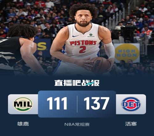 比賽開始,AJ·格林連續(xù)外線發(fā)炮拿到7分,坎寧安接連助攻后上籃加反擊暴扣回應(yīng),雄鹿繼續(xù)靠三分,活塞接連內(nèi)線暴扣或反擊反超6分,次節(jié)活塞上來里突外投全民皆兵一度領(lǐng)先到16分,羅林斯里突外投帶隊(duì)9-0追分,但鄧羅同樣打出單節(jié)13分回應(yīng),活塞半場(chǎng)75-57還領(lǐng)先18分。易邊再戰(zhàn),羅林斯苦苦支撐,坎寧安里突外投連續(xù)回應(yīng),分差被進(jìn)一步拉大,節(jié)末活塞繼續(xù)發(fā)力打出一波10-0,以112-86進(jìn)入第四節(jié)。末節(jié)回來,活塞穩(wěn)扎穩(wěn)打維持場(chǎng)上優(yōu)勢(shì),比賽逐漸失去懸念,最終活塞137-111輕取雄鹿。