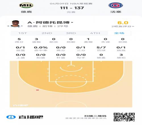 雄鹿落選秀亞歷克斯·阿德托昆博 登場4.1分鐘