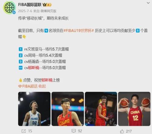 迄今為止,只有四名球員能在U19世界杯場(chǎng)均5帽,另外三位是文班亞馬(法國(guó))、楊瀚森和周琦,他們均通過選秀進(jìn)入了NBA。