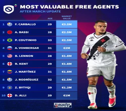 四月份德國(guó)《轉(zhuǎn)會(huì)市場(chǎng)》的最新身價(jià)更新,重新盤點(diǎn)了全球足壇最有價(jià)值的自由球員,讓大家看到在這個(gè)階段還能免簽?zāi)男┣蛐恰?/p>