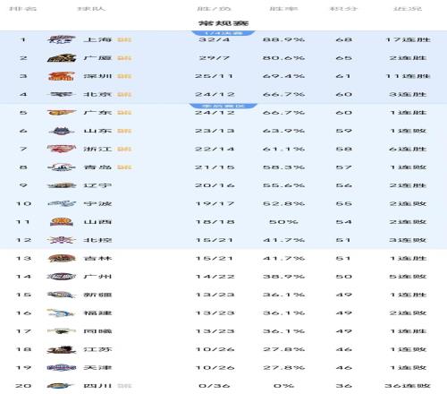 對(duì)比上賽季,本賽季的常規(guī)賽輪次調(diào)整為42輪,季后賽仍然采取3-3-5-7賽制。目前常規(guī)賽僅剩最后幾輪,關(guān)于季后賽席位的爭(zhēng)奪非常激烈,上海隊(duì)、廣廈隊(duì)、北京隊(duì)、廣東隊(duì)、深圳隊(duì)、山東隊(duì)、青島隊(duì)、浙江隊(duì)已經(jīng)晉級(jí)季后賽,還剩下4個(gè)晉級(jí)名額等待產(chǎn)生。