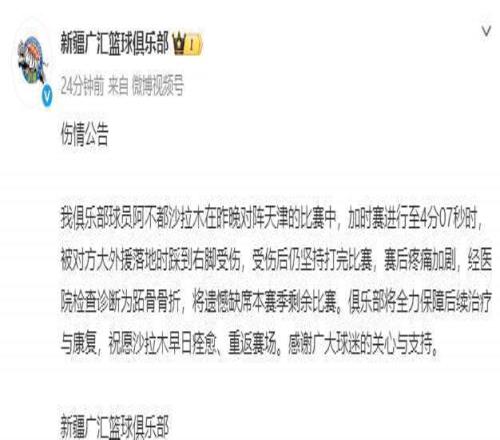 新疆男籃上場(chǎng)比賽106-101加時(shí)險(xiǎn)勝天津男籃,換帥之后首次獲得勝利,原本以為新疆男籃能夠借助這場(chǎng)勝利再次向季后賽發(fā)起沖擊,但是新疆男籃依舊沒有逃脫傷病的厄運(yùn)。新疆男籃官方宣布,阿不都沙拉木在昨晚對(duì)陣天津的比賽中,加時(shí)賽進(jìn)行至4分07秒時(shí),被對(duì)方大外援落地時(shí)踩到右腳受傷,賽后經(jīng)醫(yī)院檢查診斷為跖骨骨折,將遺憾缺席本賽季剩余比賽。在阿不都沙拉木賽季報(bào)銷之前,新疆男籃已經(jīng)連續(xù)傷了朱旭航、吳冠希、西爾扎提三名大將,此番阿不都沙拉木再次受傷之后,新疆男籃已經(jīng)徹底失去了季后賽的希望,很難與北控、廣州等隊(duì)競(jìng)爭(zhēng)季后賽席位。