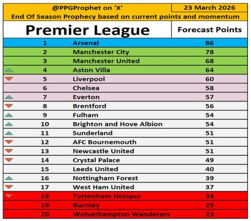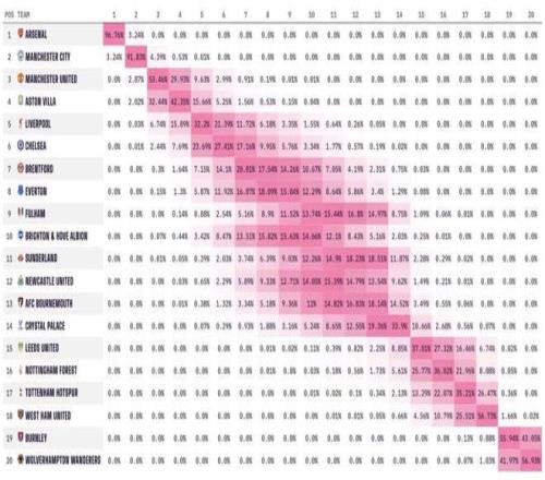 如果按照各隊目前的場均積分來計算最終的聯(lián)賽排名,曼聯(lián)有望以68分位列第三,領(lǐng)先排名第四的維拉4分。利物浦將積60分排名第五,切爾西積58分排名第六。