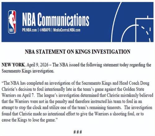 北京時間4月10日,聯(lián)盟在今日的官方聲明中宣布,NBA已結束針對國王隊的簡短調查,不會對球隊處以罰款,也不會采取任何其他處罰措施。