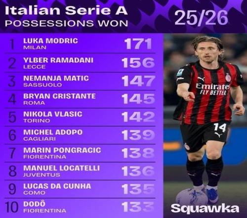 更讓人欽佩的是,40歲的莫德里奇不但出勤率高,多項(xiàng)數(shù)據(jù)也名列意甲前茅。31輪聯(lián)賽戰(zhàn)罷,他的場(chǎng)均傳球數(shù)超過(guò)66次,排名意甲第2,成功率達(dá)到90.6%,其中場(chǎng)均發(fā)動(dòng)7次長(zhǎng)傳,準(zhǔn)確率高達(dá)73.8%。魔笛累計(jì)已送出50次關(guān)鍵傳球,排名隊(duì)內(nèi)首位,所有意甲球員第9名。