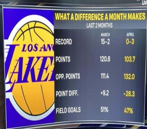 湖人客場(chǎng)挑戰(zhàn)勇士,這是東契奇缺陣后的第四場(chǎng)比賽,轉(zhuǎn)播方曬出球隊(duì)過(guò)去三月和四月的數(shù)據(jù)對(duì)比。