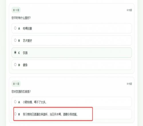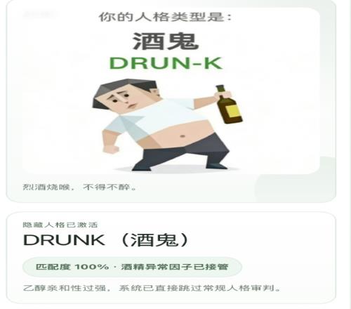 PS:該測試為娛樂測試,若該題選擇飲酒,將自動生成對飲酒態(tài)度題,選擇白酒當白開水喝,將不管其余測試結果,注定為酒鬼。