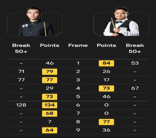 在本時段"中國德比"中,劉宏宇打出單桿71、77、128分,許醫(yī)塵打出單桿53、67分。