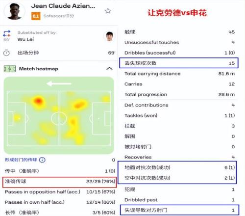 讓克勞德的傳球成功率是76%,看上去似乎還沒那么糟糕,問題是他的很多球,哪怕隊友接住了,也完全沒可能繼續(xù)向前進攻,為了把球停住,甚至需要花費極大的力氣和時間,導(dǎo)致進攻停滯。