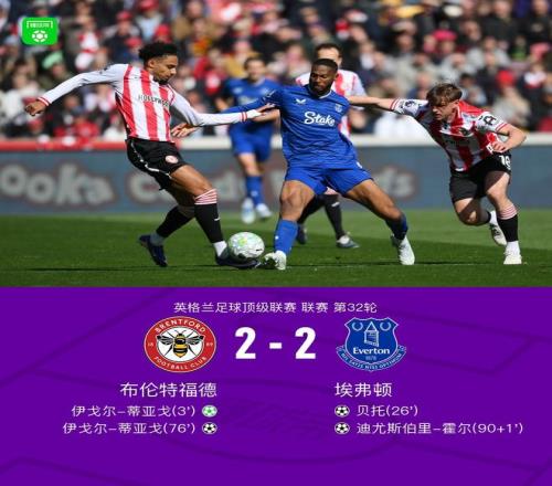 北京時間4月11日22:00,英超第32輪,布倫特福德主場對陣埃弗頓。上半場,皮克福德鏟倒沙德被判罰點球,伊戈爾-蒂亞戈點射命中,布蘭斯韋特遠射打偏,貝托頭球扳平比分。下半場,內森-科林斯頭球攻門擊中門框,卡約德射門打在伊戈爾-蒂亞戈身上彈進球門,霍爾補時抽射絕平,最終,布倫特福德2-2埃弗頓遭聯(lián)賽4連平。
