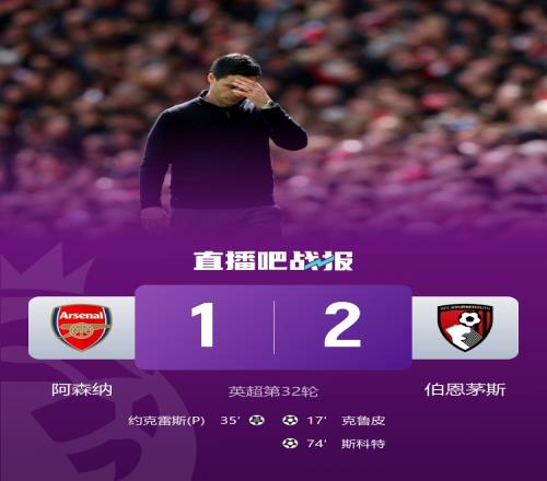 體育播報(bào)4月12日宣 英超第32輪,阿森納主場(chǎng)1-2不敵伯恩茅斯。