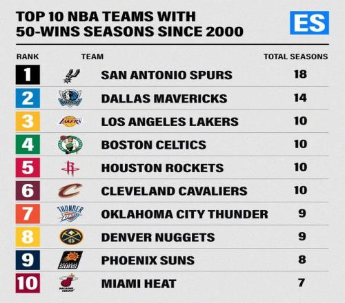 2000年至今,各隊賽季50勝+次數(shù)的排名,馬刺以18個賽季勝場50+高居榜首,獨行俠以14次緊跟其后,再往后依次是湖人、凱爾特人、火箭、騎士,都是10次。