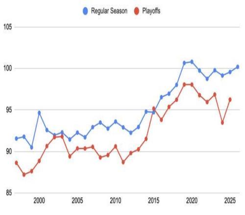總體而言,隨著比賽重要性的提升,節(jié)奏往往會(huì)放慢。自1996-97賽季以來的28個(gè)賽季中,有27個(gè)賽季的季后賽節(jié)奏都低于常規(guī)賽。平均來看,季后賽每48分鐘的回合數(shù)會(huì)減少2.7次。這并不是因?yàn)檫M(jìn)入季后賽的球隊(duì)本身節(jié)奏更慢,而是季后賽環(huán)境導(dǎo)致的變化。