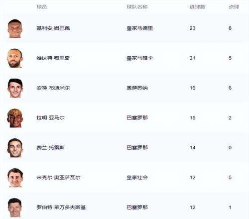 領(lǐng)跑的自然是打進(jìn)23球的法國巨星姆巴佩(皇馬),科索沃鋒霸穆里奇(馬洛卡)以21球緊隨其后??肆_地亞射手布迪米爾(奧薩蘇納)打進(jìn)16球,西班牙雙星亞馬爾(巴薩)和費(fèi)蘭·托雷斯(巴薩)分別有15球和14球入賬。