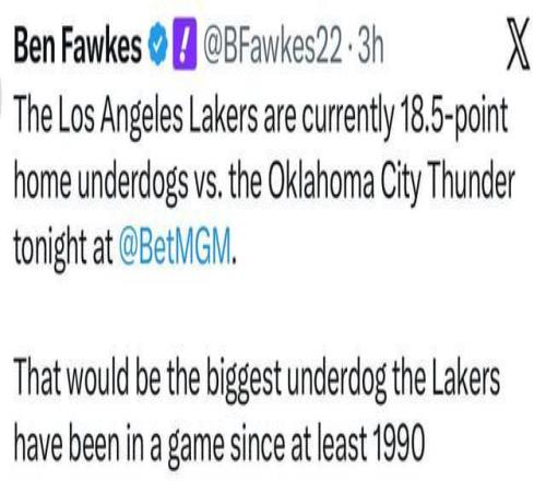 雷霆主場(chǎng)打湖人,盤口直接開到18.5分。這是湖人自1990年以來最大的受讓分差,當(dāng)時(shí)那支球隊(duì)還有魔術(shù)師、沃西、斯科特和迪瓦茨。