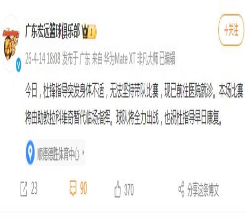 北京時間4月14日,廣東男籃官方宣布,44歲的杜鋒指導因為突發(fā)身體不適,將缺席執(zhí)教對陣寧波男籃的比賽,由助教拉科維奇暫代指揮比賽。
