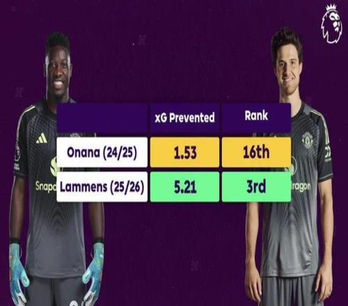 23歲的拉門斯扼殺了對手的5.21個(gè)預(yù)期進(jìn)球,排名英超第三。與之對比,2024/25賽季的奧納納,只減少了1.53球,排在英超第16位。在門將的本職工作方面,拉門斯完勝奧納納。