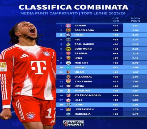 北京時間4月15日,德轉統(tǒng)計出了本賽季至今歐洲五大聯賽場均積分最高的20支球隊,拜仁慕尼黑以2.62分和+78的凈勝球高居所有球隊的第一位,西甲領頭羊巴塞羅那2.54分第二,意甲領頭羊國際米蘭2.34分第三,阿森納跌至第7位。