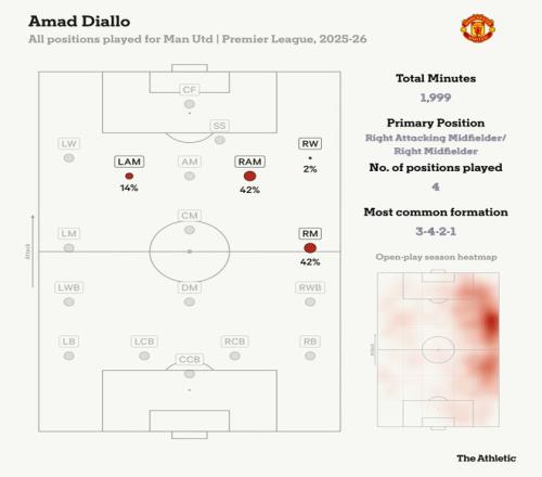 在阿莫林執(zhí)教期間,阿馬德已經(jīng)習(xí)慣了更多踢邊翼衛(wèi)??ɡ锟税阉奈恢孟蚯巴?,理論上,他應(yīng)該更多進(jìn)球和助攻,但至少現(xiàn)在還沒有。