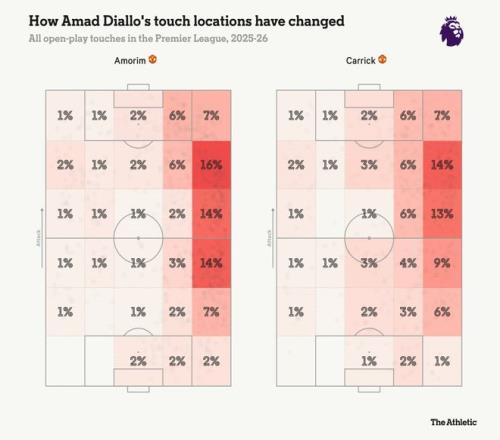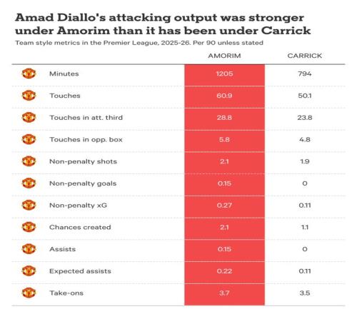 對(duì)比阿莫林麾下的阿馬德和卡里克麾下的他,從每一個(gè)標(biāo)準(zhǔn)來看,他在前任主教練體系中的表現(xiàn)都更好。然而,這或許不足為奇。