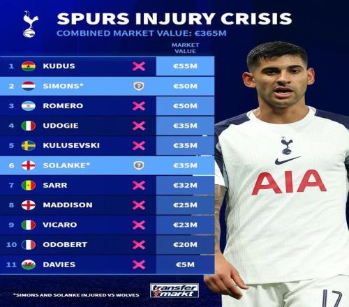 隨著索蘭克和西蒙斯的受傷,熱刺目前傷病名單已多達11人。防線有主力門將維卡里奧、隊長中衛(wèi)羅梅羅、本·戴維斯和左后衛(wèi)烏多吉,中前場有薩爾、麥迪遜、西蒙斯、庫魯舍夫斯基、奧多貝爾、庫杜斯和索蘭克。其中羅梅羅、本·戴維斯、西蒙斯、庫魯舍夫斯基、奧多貝爾、庫杜斯6人已確定本賽季報銷,維卡里奧、烏多吉大概率在本周末客戰(zhàn)阿斯頓維拉時能復(fù)出,麥迪遜、索蘭克、薩爾有望趕上之后的保級關(guān)鍵比賽。