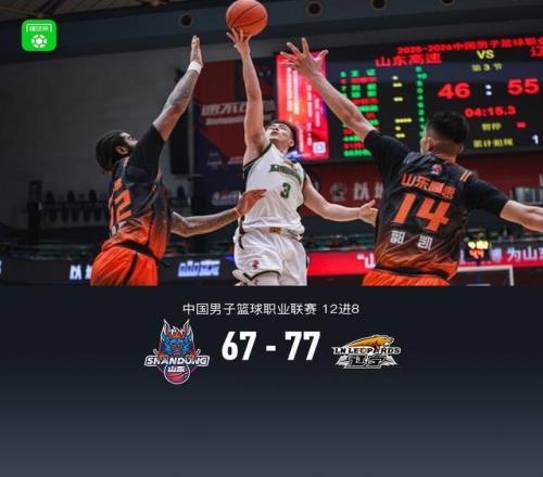 第四節(jié),開節(jié)2分多鐘雙方繼續(xù)防守拉鋸,隨后遼寧率先打開進(jìn)攻局面,鄢手騏、付豪、姜宇星相繼得分領(lǐng)先至13分,后半節(jié)上來(lái)2分鐘雙方再度持續(xù)進(jìn)攻不中,山東珀賽爾、謝智杰相繼中遠(yuǎn)投追至9分,遼寧鄢手騏三分回應(yīng),比賽還剩最后2分鐘,山東陶漢林內(nèi)線得分,隨后無(wú)力繼續(xù)反撲,最終山東67-77不敵遼寧。